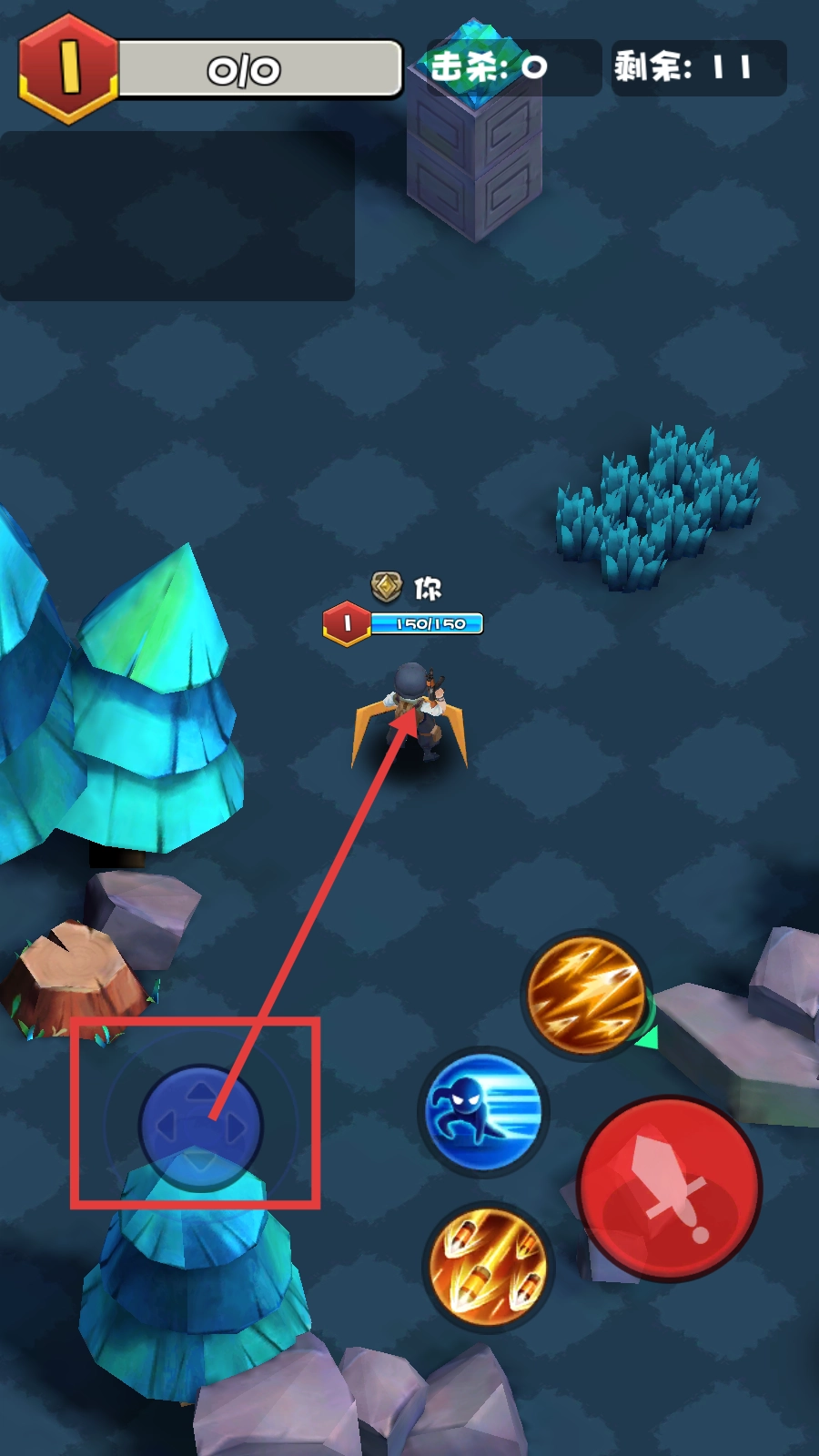 1、通过蓝色方向键操控角色移动,留意界面上的【击杀:0】与【剩余:11】提示信息,在熟练掌握操作后再启动战斗。
