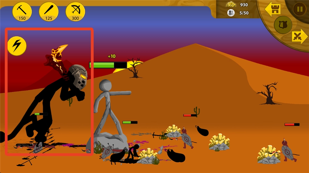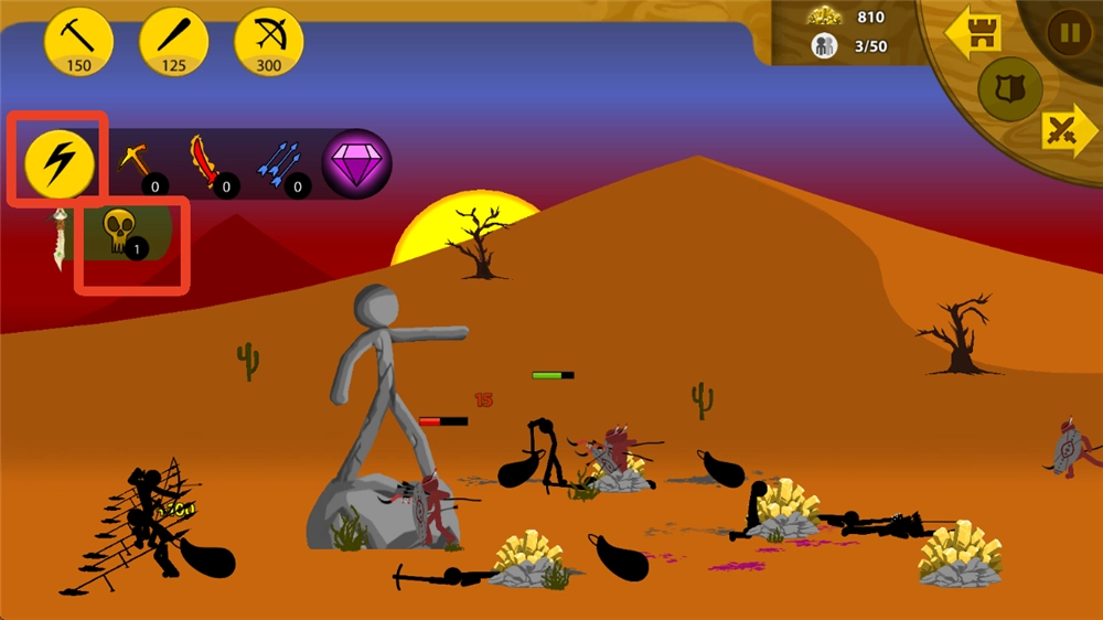 5、购买成功后,可点击战场上左侧闪电形状的按钮,接着选择下方的黄色骷髅。
