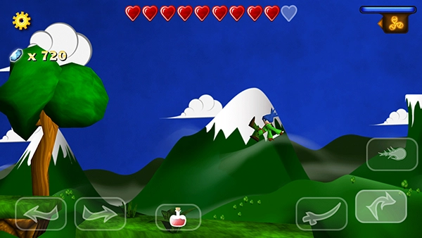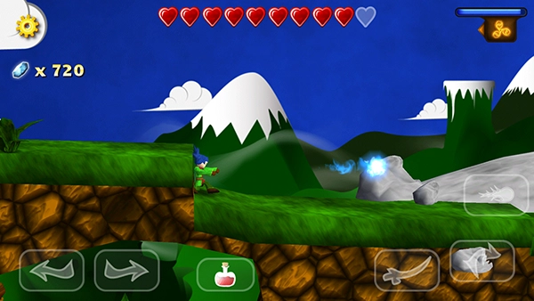 如下图右下角的图标,那个形似魔法弹的就是魔法攻击键,点击它就能发动魔法攻击。界面右上方有一条魔法能量条,当蓝色的能量条数值为0时,玩家就没办法释放法术了。不过能量条会随着时间自动恢复能量,另外,玩家也能在游戏里拾取小蓝瓶,直接把能量补满。