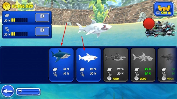 4、花费金币解锁各类鲨鱼,每种鲨鱼具备独特的攻击属性,助力提升破坏能力。
