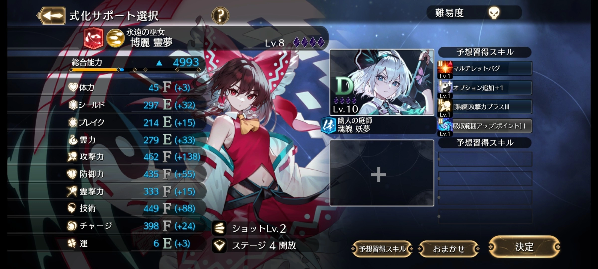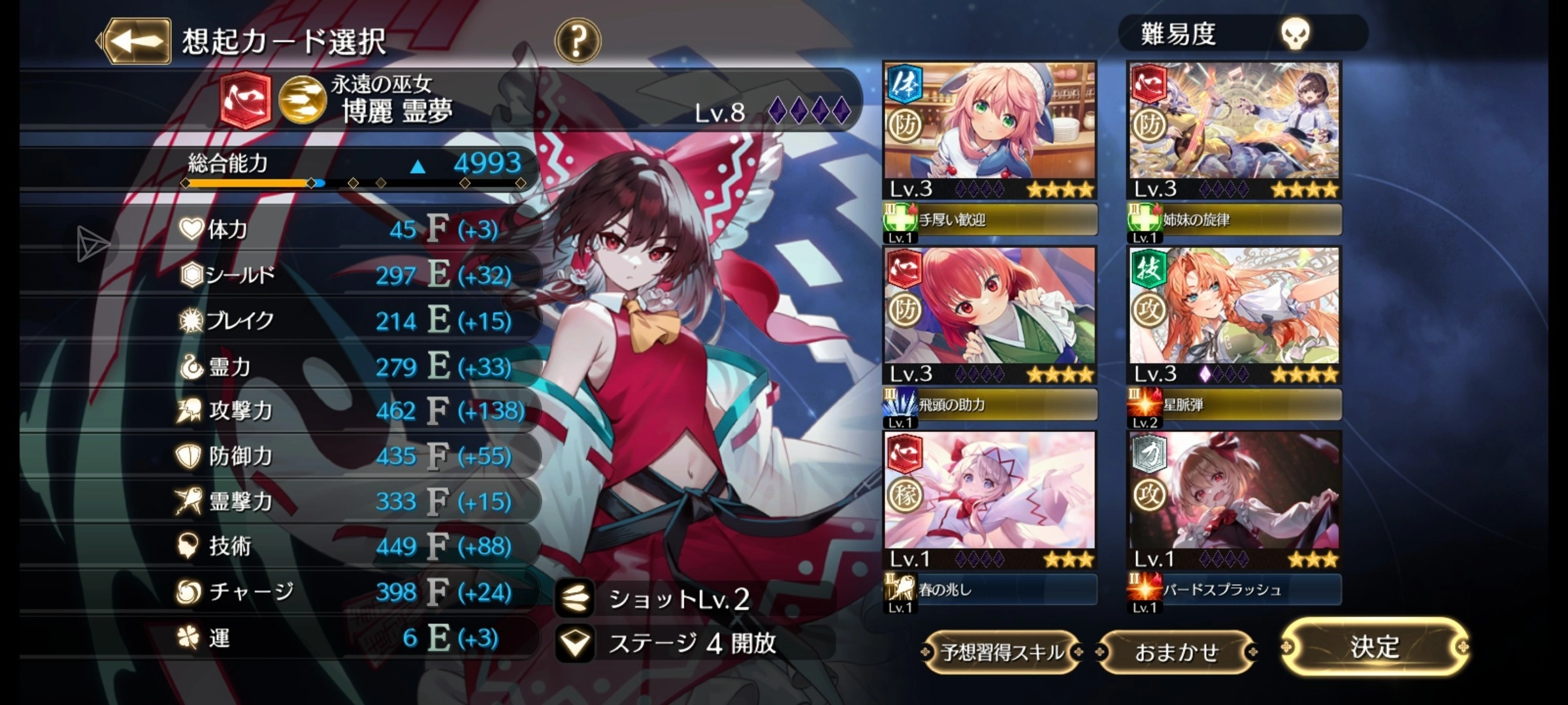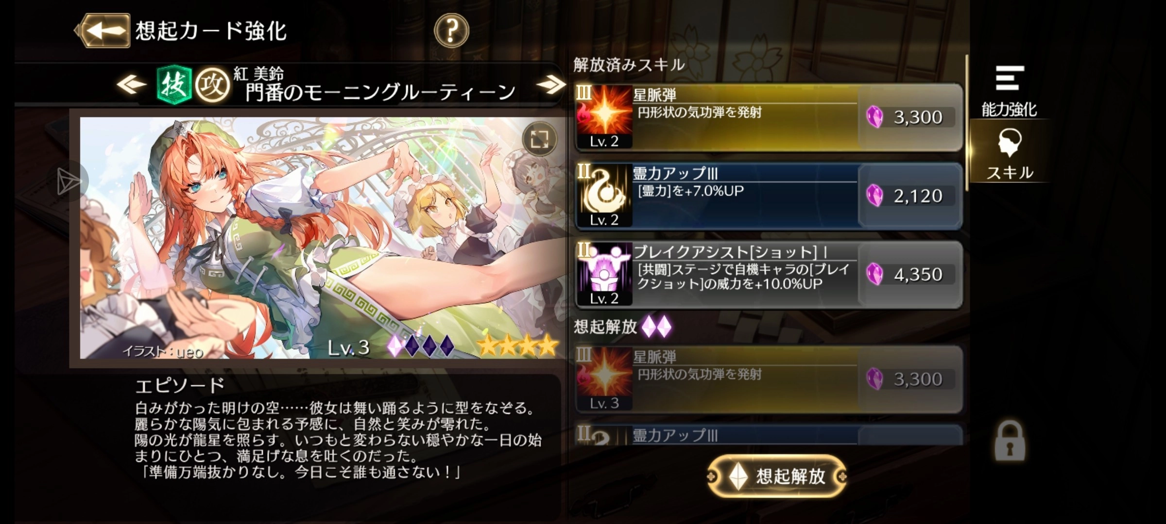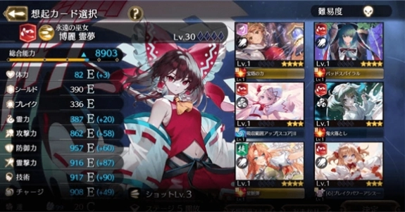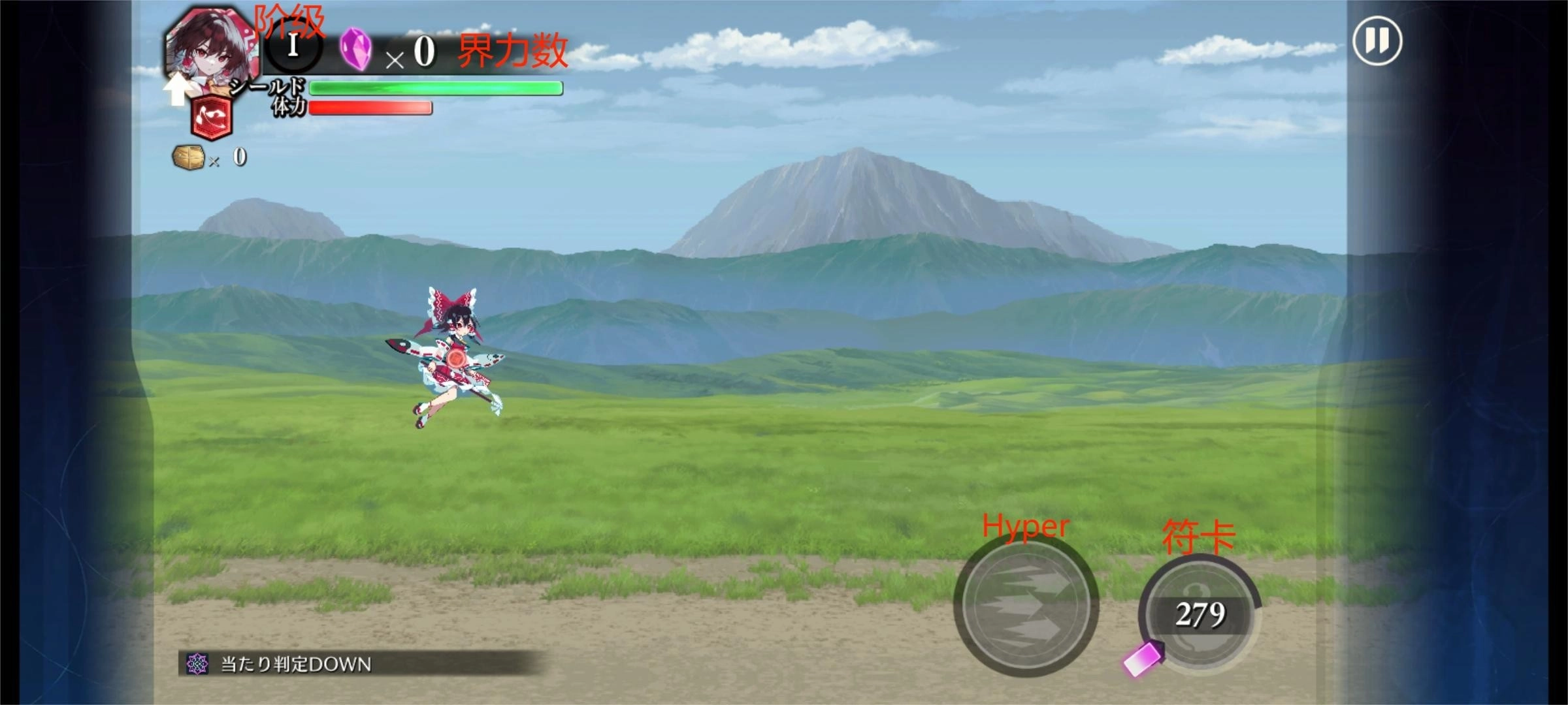 技能是有阶级的,主动技能通常阶级更高,高阶级的技能显然是更厉害的。如下图的卡中,美铃的第一个技能星脉弹是III阶技能,第二个灵力提升是II阶技能,第三个共斗技能也是II阶技能。只有角色的阶级达到技能要求的阶级才能Roll出该技能,而角色的阶级取决于关卡内捡到的黄色勾玉(也可能包括消弹和获得界力),开每个角色专属符卡(消耗一半的槽)会全屏消弹并获得大量黄色勾玉,如果开着Hyper并在符卡期间击败Boss会全屏转换子弹为界力,抓住时机!